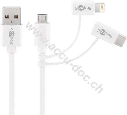 Goobay 3in1 Kombi-Kabel, Weiß, 1 m, Hängbarer Karton - mit Micro USB, USB-C™ und Apple Lightning Anschluss