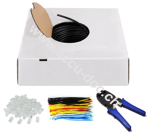 Netzwerkkabel-Set besteht aus 1x CAT-6-LAN-Kabelrolle, 1x Crimpzange, 100x farbige Kabelbinder und 100x RJ45-Stecker.