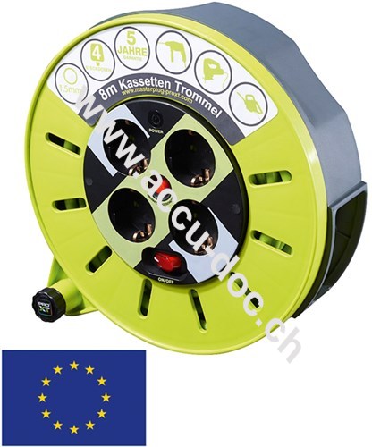 Masterplug Kabeltrommel mit Kabelführung 8 m, Grau-Grün, Staubschutztüte - Kabelrolle mit 4 Schutzkontaktsteckdosen mit Überspannungsschutz