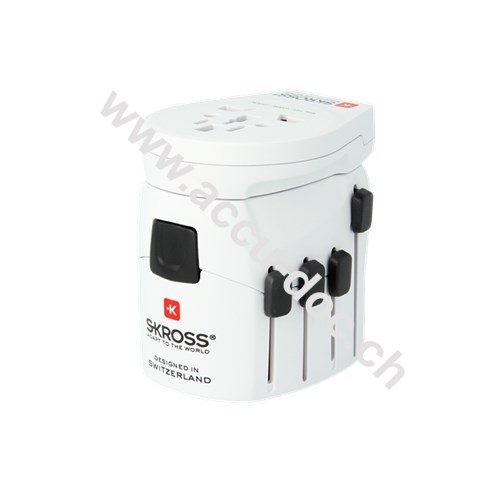 Skross World Adapter PRO World & USB, Weiß, Hängbarar Fenster-Karton - geeignet für alle geerdeten und ungeerdeten Geräte (2- und 3-polig), mit integriertem USB-Ladegerät