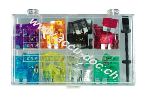 je 10 Stück: 3 A (violett), 5 A (orange), 7,5 A (grau), 10 A (rot), 15 A (blau), 20 A (gelb), 25 A (klar) und 30 A (grün)