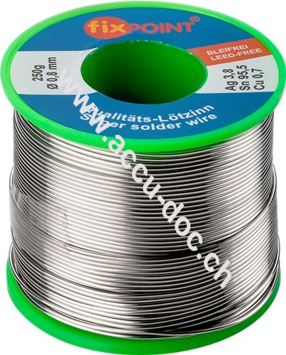 Profi-Lötzinn bleifrei, ø 0,8 mm, 250 g - Zusammensetzung: 3,8 % Silber, 0,7 % Kupfer, 95,5 % Zinn, Flussmittelanteil: 2,5 %, Schmelzpunkt 217° C