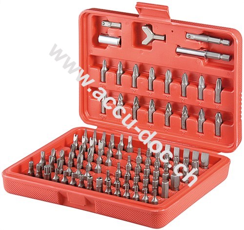 Bits: 8x Kreuzschlitz (PH), 8x Kreuzschlitz (PZ), 4x Vierkant, 3x Kreuzschlitz (Torq), 9x Flachschlitz, 4x Spanner, 9x Keilprofil, 9x Keilprofil mit Stift, 4x Tri-Wing, 3x Clutch, 19x Innensechskant, 3x Vielzahn, 12x Innensechskant mit Stift